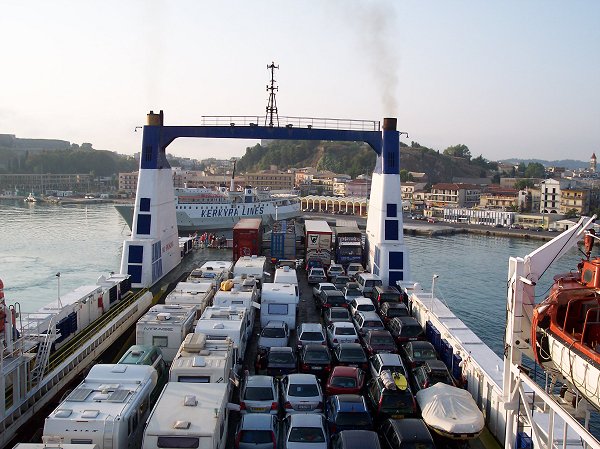 På vej ind til Korfu kl. 06.36 om morgenen den 27. juli 2005 Fårene er i lastbilen bagerst nr. 2 fra venstre. To af de andre lastbiler bagerst havde kvæg og andre dyr med.