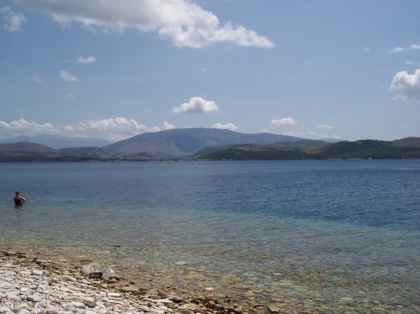 Albanien set fra stranden på østkysten på den nordlige del af Korfu.