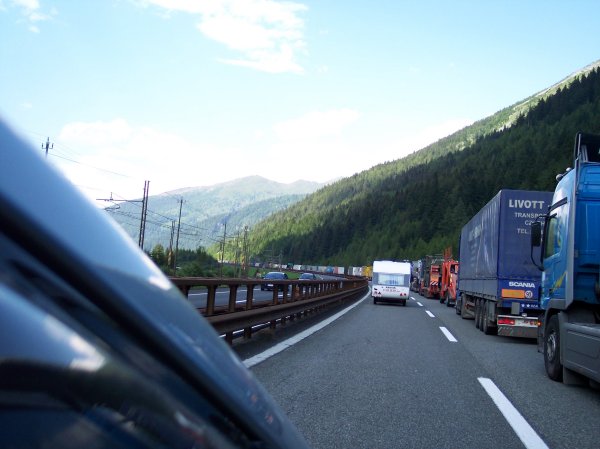I en 2 timer lang kø ved Brenner. Lastbilerne bevægede sig ikke så meget som en centimeter. Vi kom dog en lille smule frem på 2 timer.