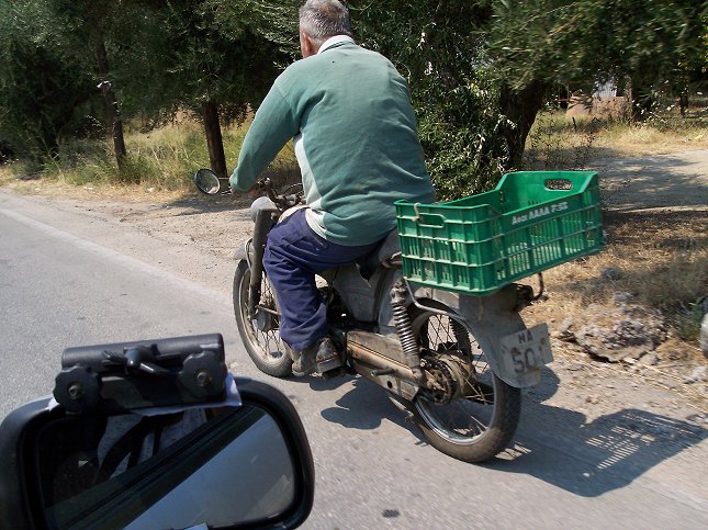27. juli: Græsk fisker (?) på knallert og med mælkekasse. :-)