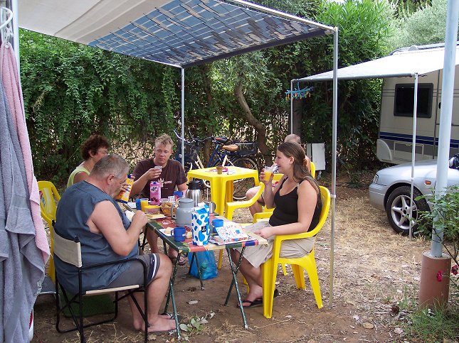 13. juli: På Camping Kato Alissos. John har været i byen og købt et bord og 4 stole til 50 euro.