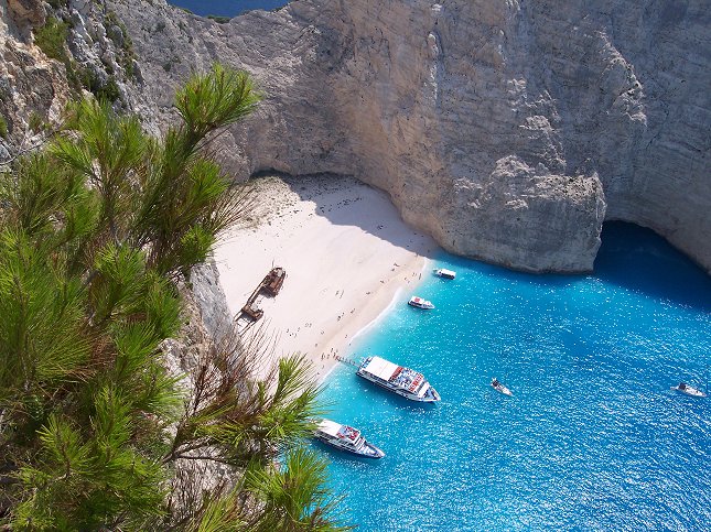 16. juli: På nord-vestsiden af øen, udsigt til stranden med et skibsvrag. John har taget billedet for mig, jeg skulle ikke ud på den lille altan at stå!