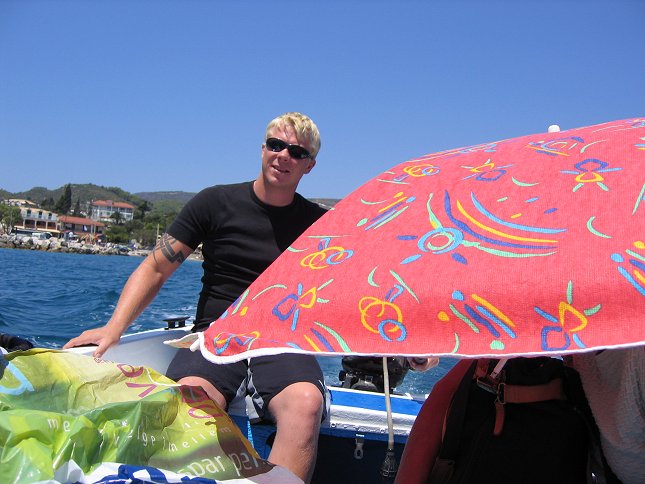 23. juli: Christoffer - og mig - godt gemt under parasollen, som jeg havde medbragt i tilfælde af, at vi ikke fik en båd med soltag. Billedet er taget af Kirsten.