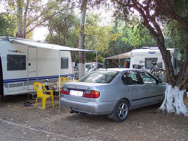 26. juli: Vores pladser på Camping Kato Alissos. Man kommer hinanden ved - der er ikke så langt mellem de enkelte pladser, men det er ikke usædvanligt i udlandet, de har sikkert ikke de samme krav om bestemt afstand aht. brandfaren.