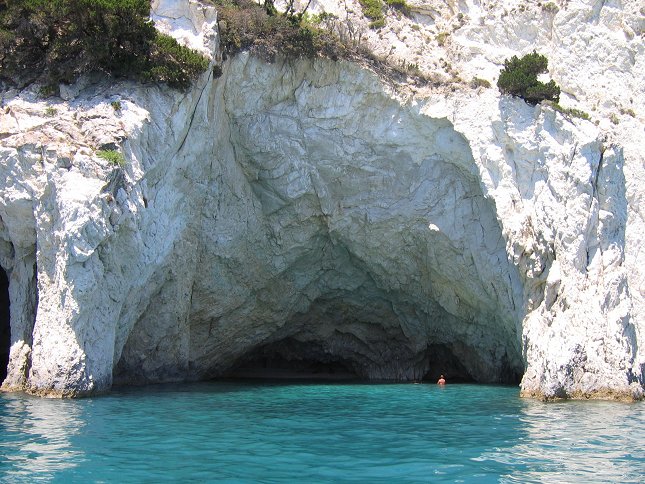 23. juli: Grotte på Marathonisi island. Den ser ikke særlig stor ud på billedet, men det var den, vi sejlede ind i den, og vi fyldte ikke meget i denne grotte. Bemærk manden inde i grotten.