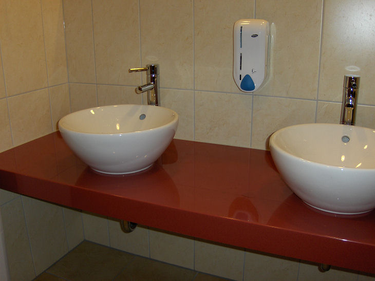 Den ene baderumsbygning, som vi ligger op af: - med meget flotte toiletter og bruserum, men det er den anden bygning, jeg har set frem til at besøge igen; der har man sit eget marmor-badeværelse helt for sig selv. Vi har set mange flotte baderum på campingpladser, men det er svært at finde noget, der overgår Tonis. Campingpladsen er 5 stjernet og så kan man endda benytte camping cheques her.