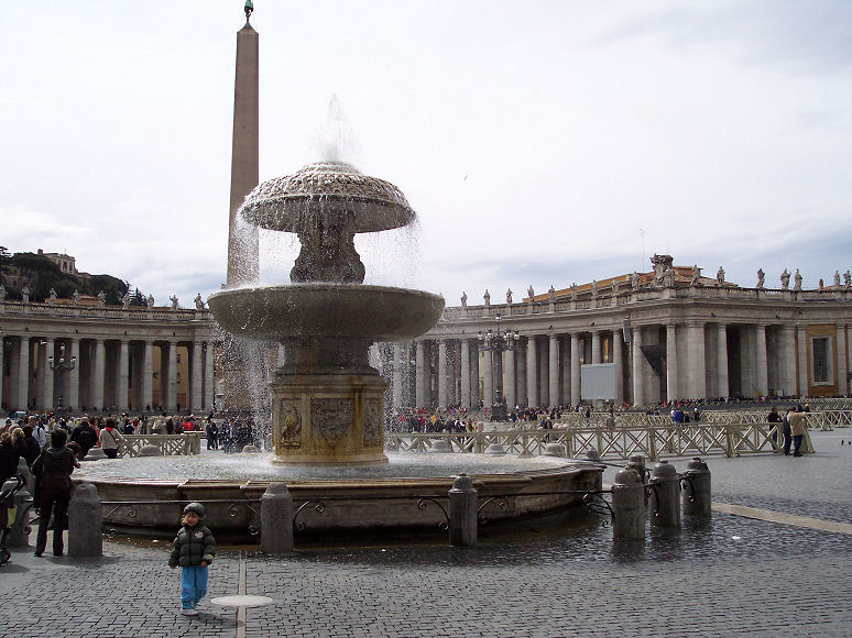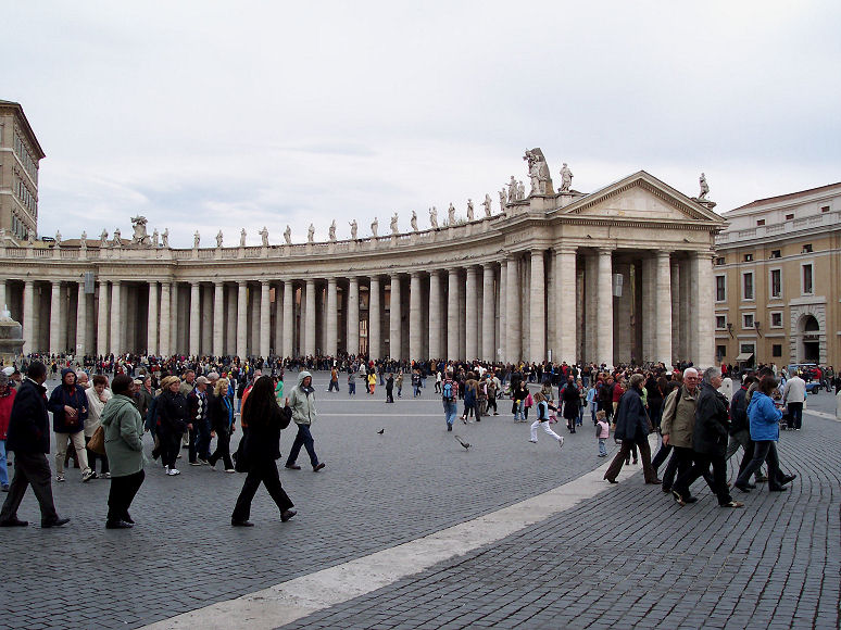 Derefter kørte vi ind til Peters Kirken. Der var en meget lang kø for at komme ind i kirken, men det tog ikke ret lang tid om at komme til indgangen. Man skal gå gennem en metaldetektor og tasker skal også køres gennem en metaldetektor, før man får lov til at komme ind på kirkens område. Da vi var kommet til indgangen af kirken, stillede vi os op i en kø sammen med et hav af mennesker. Vi troede, at det var den eneste måde at komme ind i kirken på. Efter en halv times tid og kun ca. halvvejs i køen, gik vi ud af køen igen, da det gik op for os, at vi vist stod i kø for at komme op i kuplen. Vi gik en tur ned i kælderen til pavegravene. Og derefter fandt vi ud af, at man kan gå lige ind i selve kirken uden at stå i kø - og helt gratis.