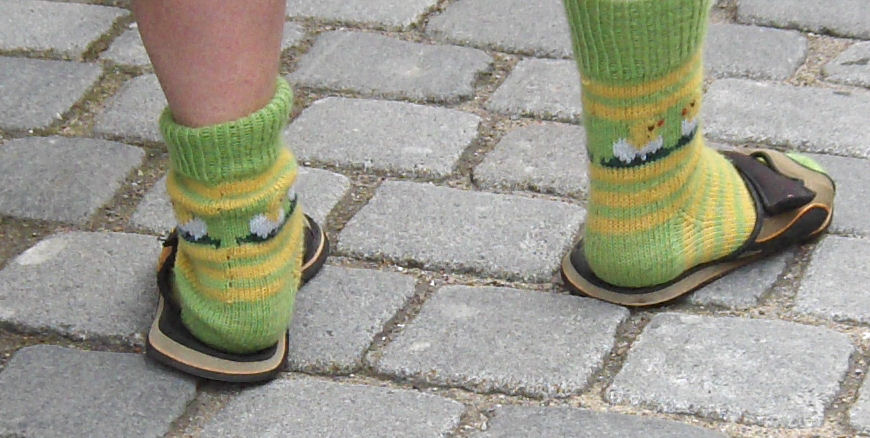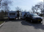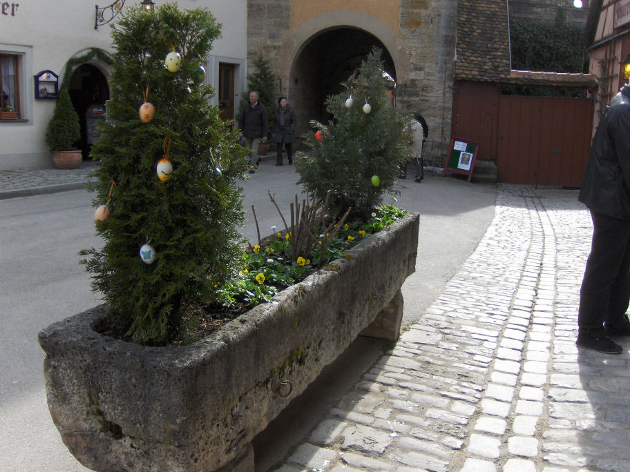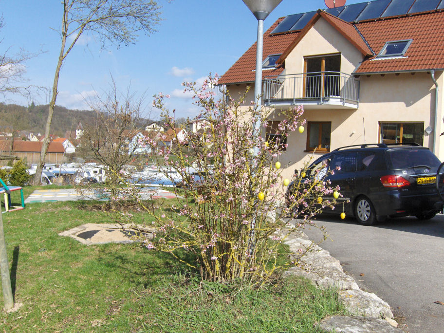Ankomst omkring middagstid til Camping Romantische strasse, Creglingen-Münster, side 394 i Camping Cheque bogen. Der er påskeæg på mange buske og træer, det er langfredag i dag.