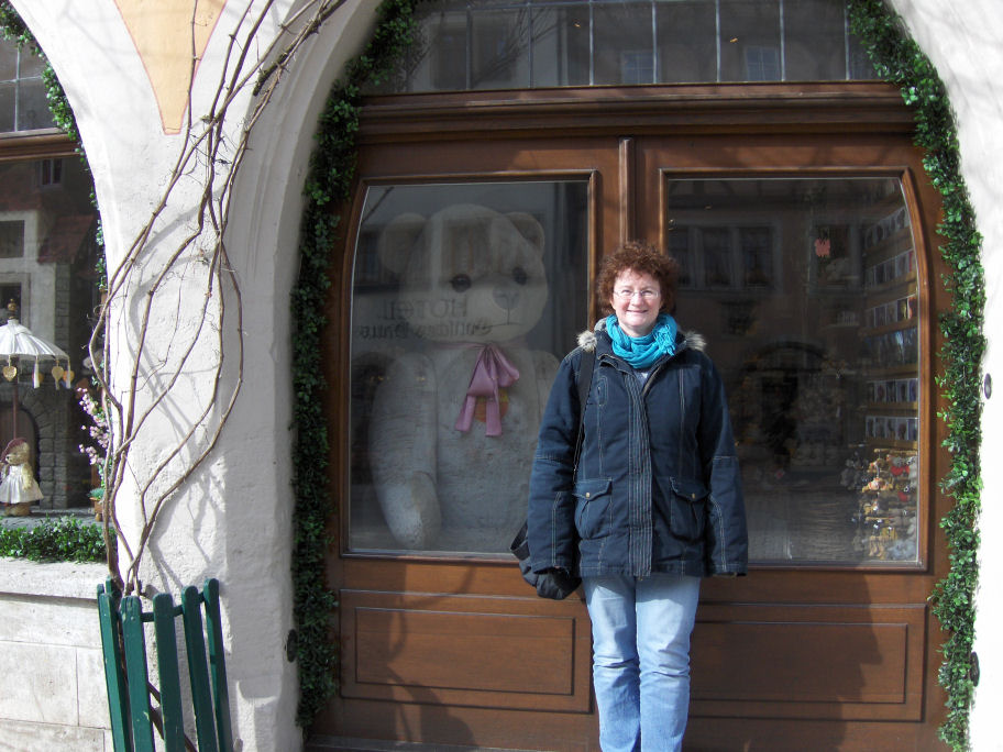 Kirsten - og en kæmpe bamse bag butiksdøren