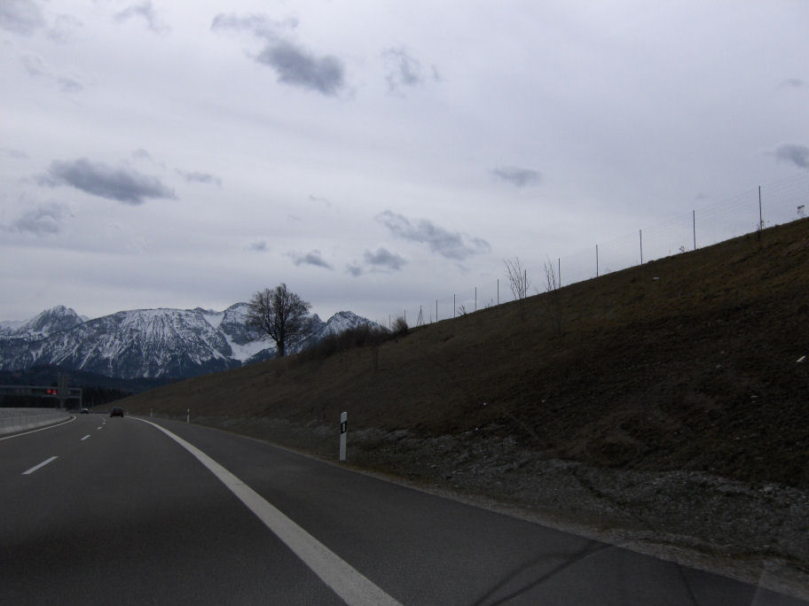 Holder i køen til højre, for at komme væk fra en stillestående 2½ km lang kø til venstre. Vi skulle egentligt have været gennem bjerget i køen til venstre, men ifølge trafikoplysningerne på TomTom, var køen 2½ km lang og køen havde været der i meget lang tid, så vi kørte fra, da muligheden var der - i sidste øjeblik.