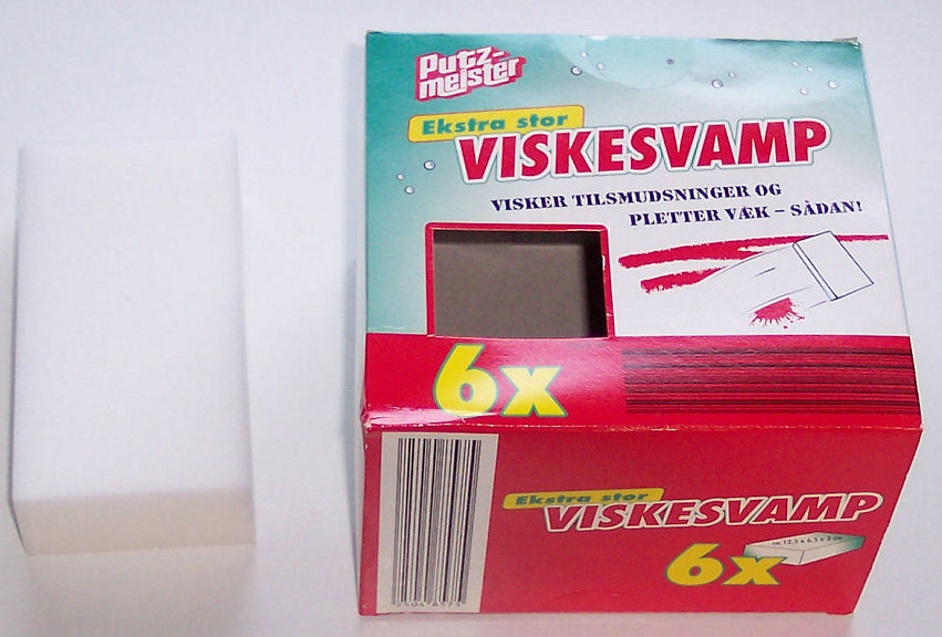 I går på vej hertil var der en postbil, der havde fuld stop, der kørte ud - lige imod os, uden at tage farten af - og snittede en rude i campingvognen, sikke en klovn, men heldigvis gik det ikke værre end det gjorde, og det kan man jo kun være glad for! Kresten bruger en viskesvamp fra Aldi (se billedet til højre herunder) i et forsøg på at polere mærkerne fra postbilen væk, det lykkedes meget godt: