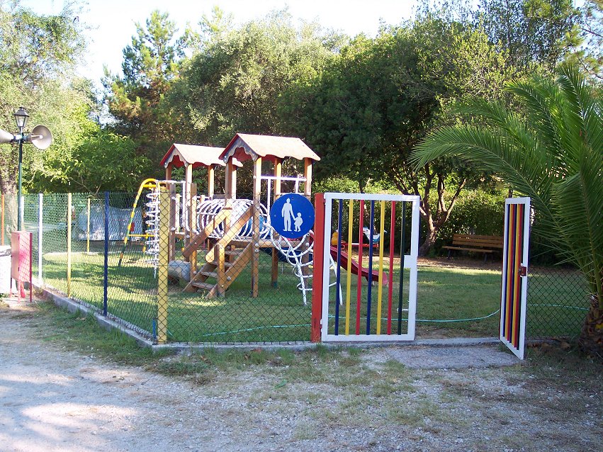 Vores egen strand og legepladsen på Camping Karda Beach tidligt om morgenen:
