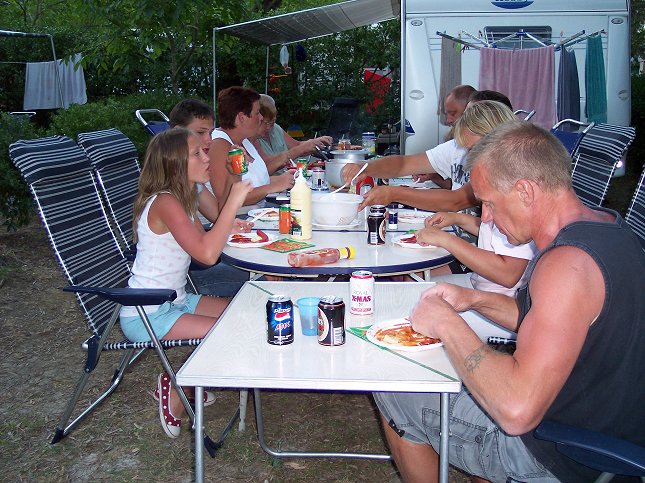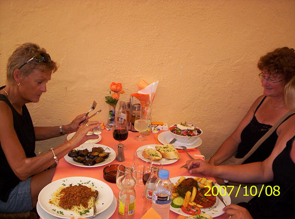 Om aftenen spiser alle en forsinket fødselsdags-middag ved Kirsten og John: Et par fra Mariager, Aage og Bodil, kom forbi og fik en snak. Det er vores tredje campingtur til Korfu, men det er første gang, vi møder andre danske campister på stedet.