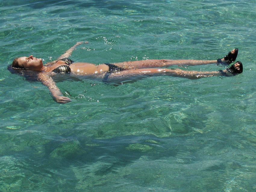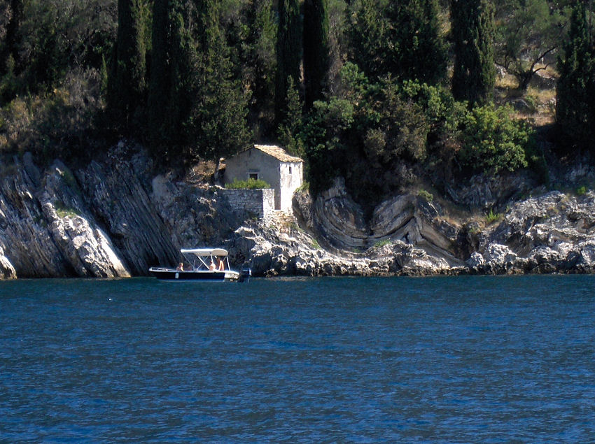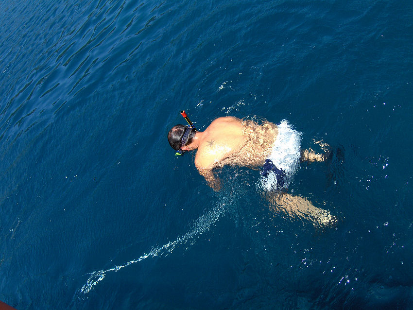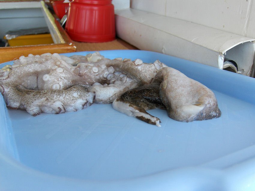 Vores skipper vil forsøge at fange en blæksprutte og hælder noget blåt i vandet, så blæksprutten ikke kan se noget, det gør det lettere at fange den. Det lykkedes også. Bagefter blev den slået mange gange ned i stenen. Vi har set det før og tror, at det gøres for at mørne kødet. Da vi havde spist og skulle sejle videre, kunne ankeret ikke trækkes op, det havde sat sig fast i en sten. Linen blev kappet og vores skipper dykkede ned for at trække ankeret fri igen.