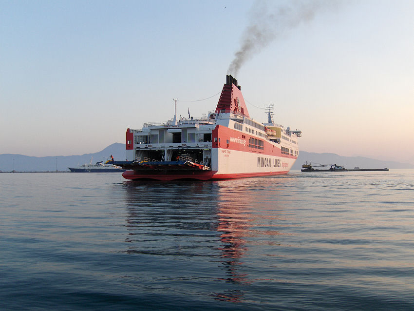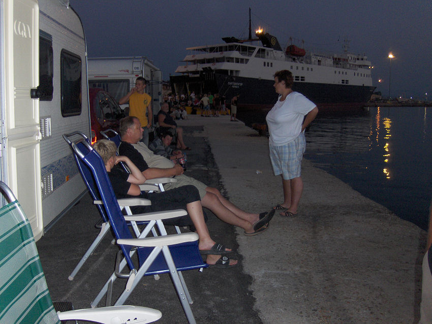 Ved 6.30 tiden lægger der en stor færge til kajen, hvor vores campingvogn står. Der var ingen rampe på stedet, så vi havde ikke forestillet os, at vi kunne være i vejen for nogen. Vi fik dog lov til at blive holdende. Det var nu heller ikke let at komme hverken frem eller tilbage, for der holdt mange, der skulle med færgerne.
