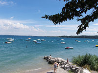 Vi kører først til det store Auchan varehus i Verona og derefter kører vi mod Camping La Ca, der ligger på sydvest-siden af Gardasøen. Kirsten og John har bestilt pladser til os hjemmefra. Det var umuligt at booke os ind på en campingplads på øst-siden af søen. Da vi kommer ind på pladsen, skal vi køre ned at den mest stejle bakke, vi nogensinde har kørt på, men ned kan man jo altid komme. Campingpladsen er bestemt ikke egnet for ganghandicappede, hvis man vil gå op til restauranten og swimmingpoolen!