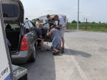 Klokken blev 15.15, før vi kom gennem grænsen ind i Serbien! 3 timer i bagende sol. Noget af tiden havde vi aircondition slået til, og da jeg på et tidspunkt ville åbne vinduet lidt for at tage et billede, sagde det BANG! Det var vinduet, der røg ned med et brag. Jeg tror, at det er de tjekkiske veje, der har rystet noget løst i døren. Vi kørte ind på den første rasteplads efter grænsen, Kresten skilte døren ad, men måtte opgive. Så indtil videre er mit vindue lukket permanent, med en skruetrækker stukket fast under vinduet for at holde det på plads og døren kan ikke åbnes.