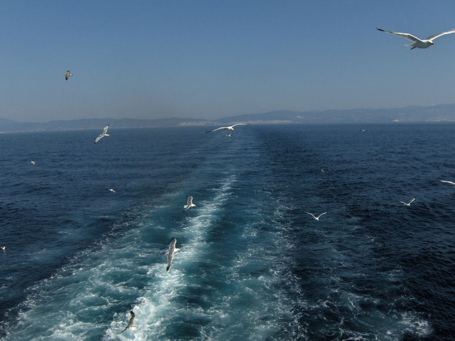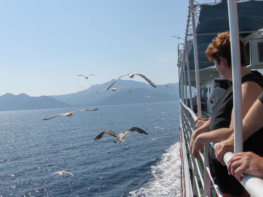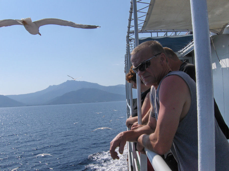 På det sidste stykke ind til Thassos hvirvlede færgen småfisk op, som mågerne spiste.
