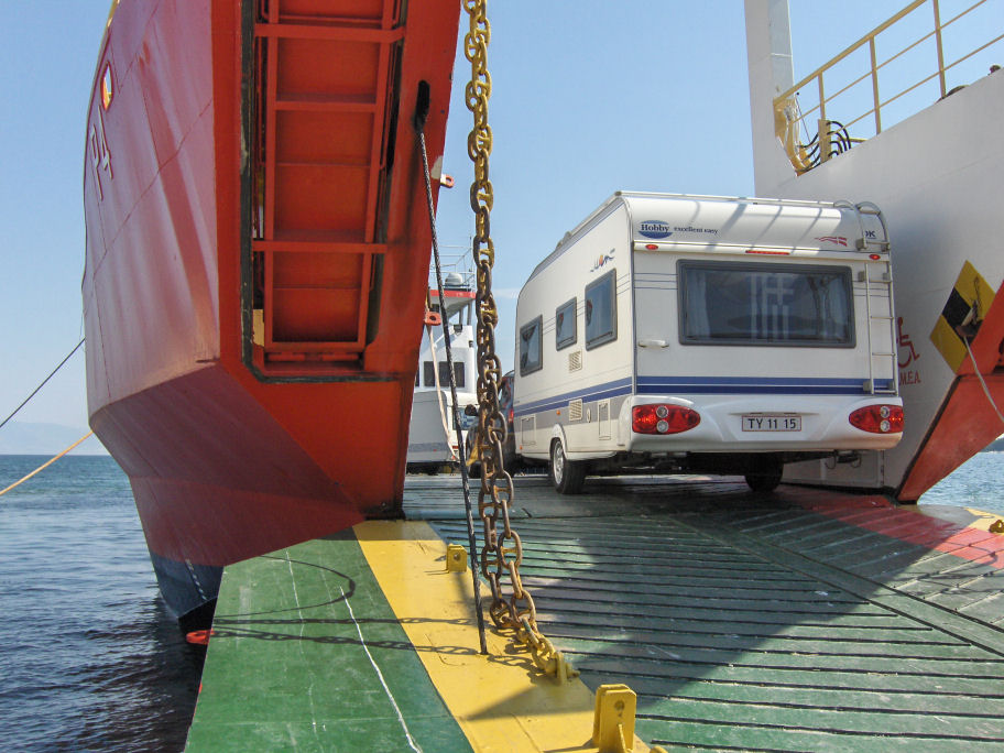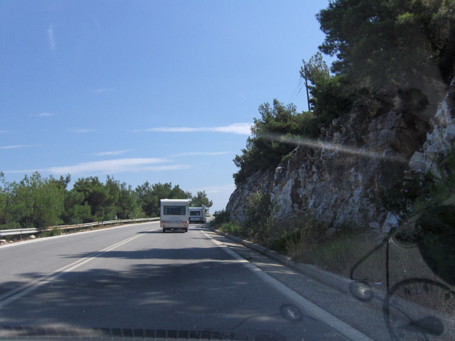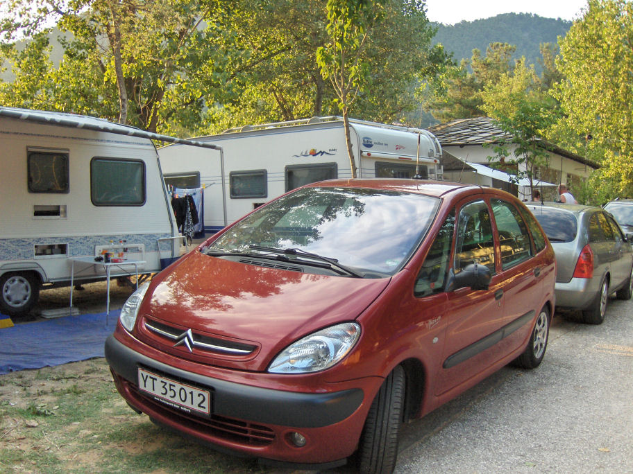 Vi har planlagt hjemmefra, at vi vil bo på campingpladsen Golden Beach i Panagia. Der er 27 km til campingpladsen fra færgehavnen.